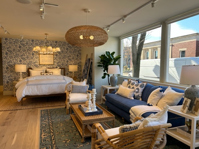 The approximately 6,000-square-foot Birmingham Design Shop of Serena & Lily features vignette showpieces, from outdoor areas to living areas and bedrooms. “Our design rooms are treated as inspiration,” said a marketing team leader. All of their furniture can be custom ordered in one of their many upholstery options, with all of their fabric and upholstery made in North Carolina. An extensive swatch display features more than 300 original Serena & Lily textile and wallpaper designs, many in their iconic blue and white palette. “We treat blue as a neutral,” they noted.
